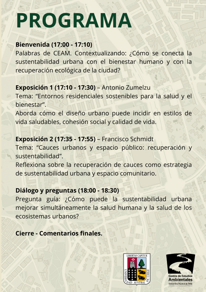 La actividad contará con las exposiciones de Antonio Zumelzu, académico que presentará “Entornos residenciales sostenibles para la salud y el bienestar”, y del arquitecto Francisco Schmidt, autor del libro “Sequía, ciudad y recuperación de cauces urbanos”, quien reflexionará sobre el rol de los cauces urbanos como espacios públicos de recuperación y resiliencia ambiental.