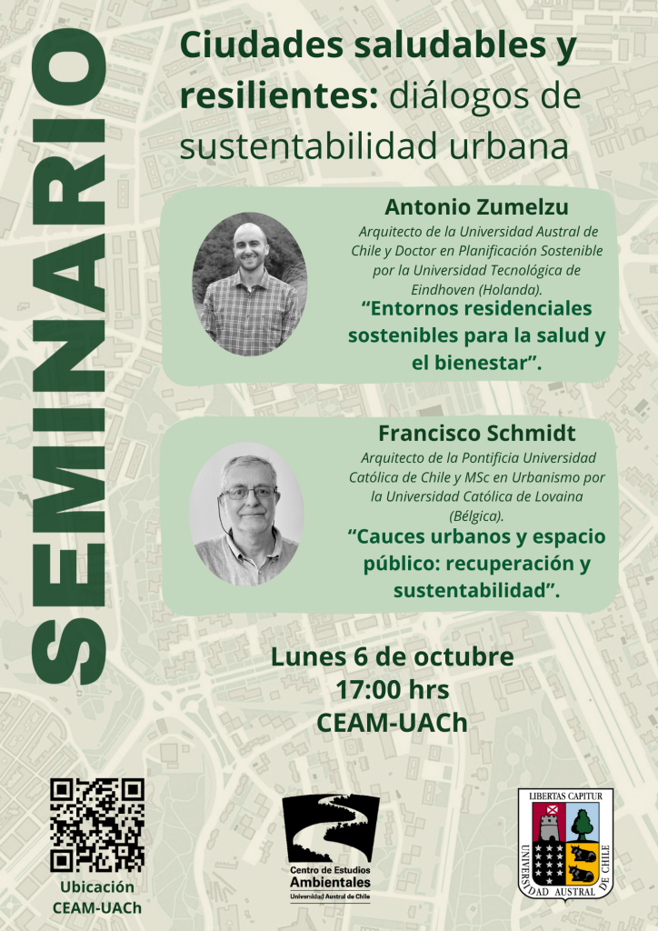 El próximo lunes 6 de octubre, a las 17:00 horas, en la Sala CEAM de la Universidad Austral de Chile, se realizará un seminario sobre “Ciudades saludables y resilientes: diálogos de sustentabilidad urbana”, organizado por el Centro Transdisciplinario de Estudios Ambientales y Desarrollo Humano Sostenible (CEAM-UACh) y su Programa de Honor.